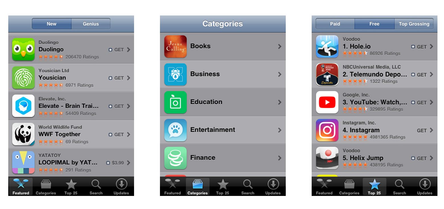 В лминуксе с самого начала были попытки сделать подобие витрины что бы устанавливать приложения из репозиториев просто кликая мышкой (выглядело примерно так). В это время в параллельной вселенной, где программы сроду устанавливались со съемных носителей или с торрентов сайтов разработчиков, некто по фамилии джобс презентавал айфон, в котором никакая установка приложений не предусматривалась (джобс кивая на кпк с виндовс мобаил говорил что "у нас так не будет, а будет предустановлено все для вас необъодимое"). Группа хакеров-энтузиастов взломала защиту и выяснила что айфон ос вполне полноценный юникс, на который можно ставить программы и запилила туда дебпакеты. В это время другая команда уже отечественных хакеров решила запилить свои репозитории с платными приложениями. Так наайфоне появилось два маркета - Сидия (посути она как F-Droid) и чисто коммерческий icy-installer от RipDev (но тоже на основе deb-пакетов). Скриншотов не сохранилось (только прощальное письмо с завершением проекта) но магазин выглядел очень похоже на первые апсторы от эпл (пикрил2).
