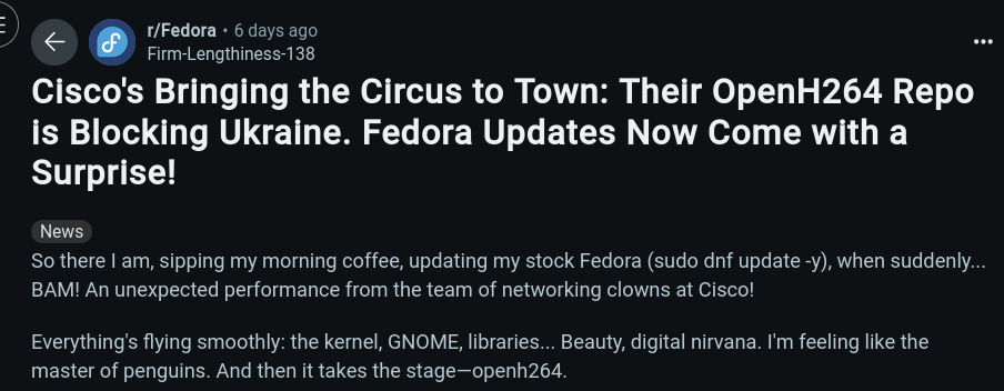 Решил перестать быть арчепидором и накатить дистрибутив который просто работает без п-вординга. Скачал федору. Загрузился с флешки. Первый раз не загрузилось (черный экран 5+ минут), ребутнулся по кнопке. Второй раз загрузилось, но инсталлятор крашнулся на этапе открытия, предложив мне отправить репорт в мозилу (больше не запускался). С третьего раза он открылся и даже накатил ОС. Загружаюсь в ОС. Что бы вы думали? Первый раз не загрузилось. Второй раз загрузилось, появился экран первичной настройки. На стадии выбора таймзоны экран пошел артефактами и компутер завис наглухо. После этого ОС перестала загружаться с черным экраном. У меня блять вопрос, какого хуя так ведёт себя один из устоявшихся мейн дистрибутивов рассчитаный на домохозяек и чтобы все было просто. Второй вопрос - какого хуя арч у меня загружается секунд 10, а это говно по минуте плюс?