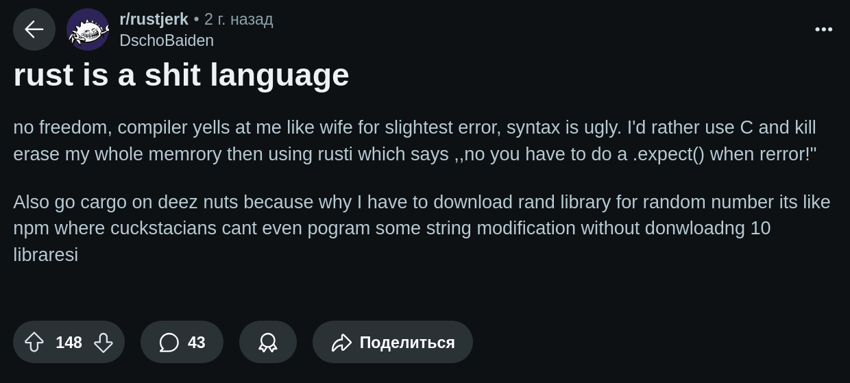 >>3640271 >>3640272 Некоторые языки действительно лучше, просто менее популярны, тот же PowerShell приятней и круче Баша, Раст тоже лучше Сишки, многие разработчики осуществляют переход на него.