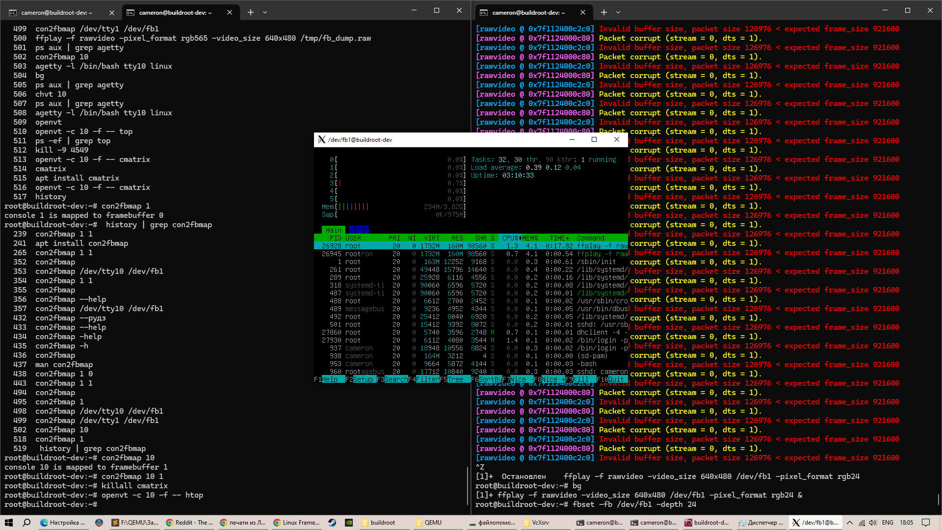 >>3641669 В левой консоли указано запустить программу htop в виртуальном фреймбуфере. В правой консоли запущена ffplay (входит в состав пакета ffmpeg). Это простой консольный видиоплеер. В середине окно ffplay, отображающее фиртуальный фреймбуфер с запущенной там htop. Размер окна 640х480, цветность 24 бит.