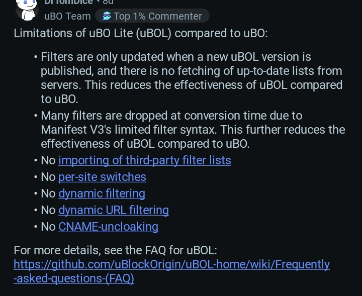 >>3643631 > Слушай, а если ublock выключить, то ещё лучше ситуация будет. Никто не говорит, что Lite это полноценный заменитель, в том числе и сам разработчик, но за неимением альтернатив в скором времени оптимальное решение: совместимость с mv3, permission less и быстрая скорость загрузки DOM и Content, при наличии блокирования рекламы с прохождением тестов в бенчмарке на 100%. Годнота, одним словом. Жаль, быдло боится.