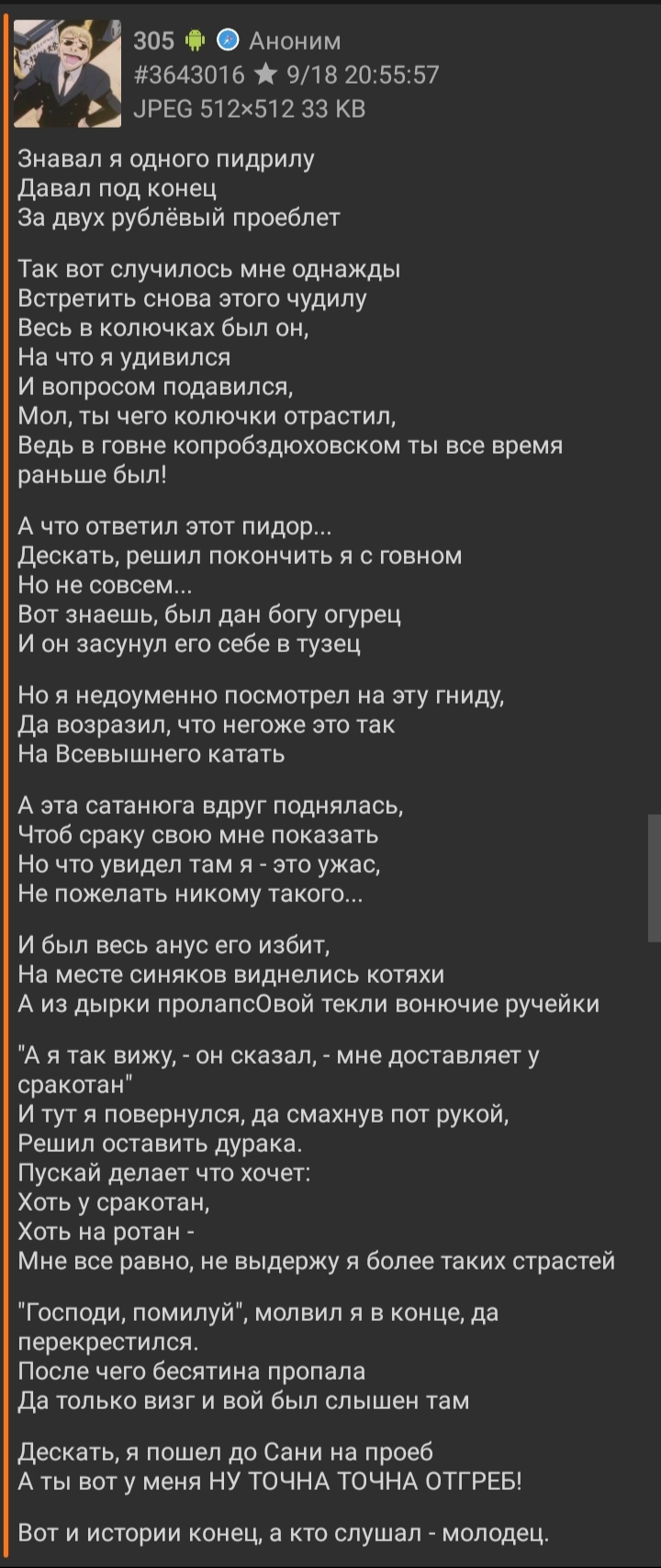 А что ответил этот пидор... Дескать, решил покончить я с говном Но не совсем... Вот знаешь, был дан богу огурец И он засунул его себе в тузец
