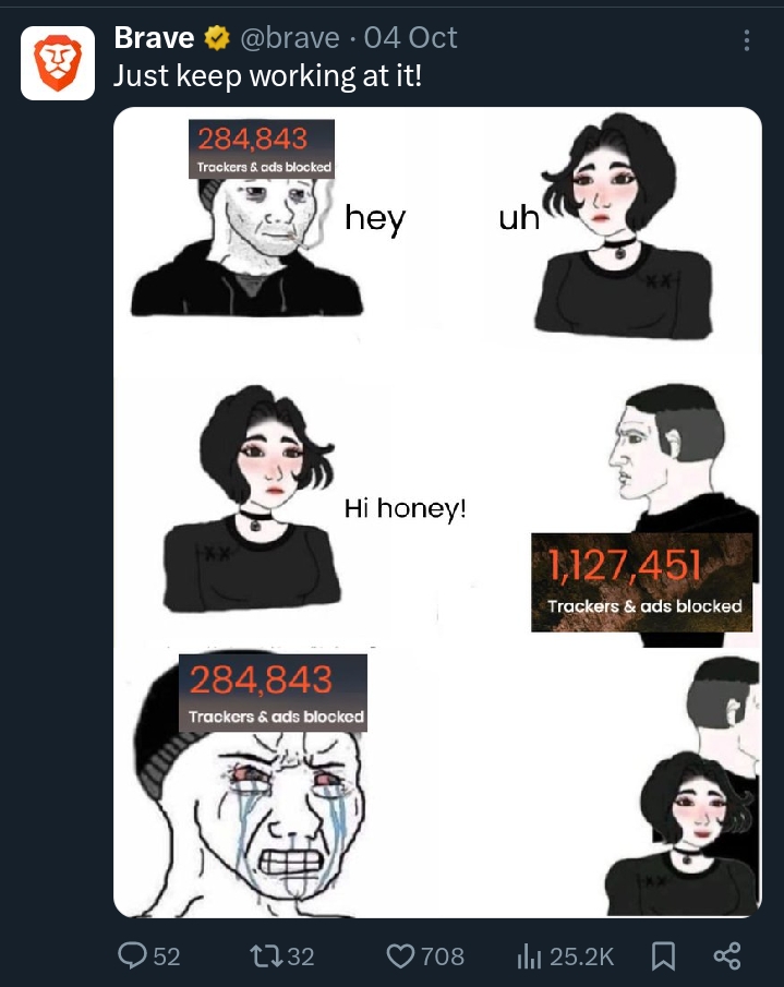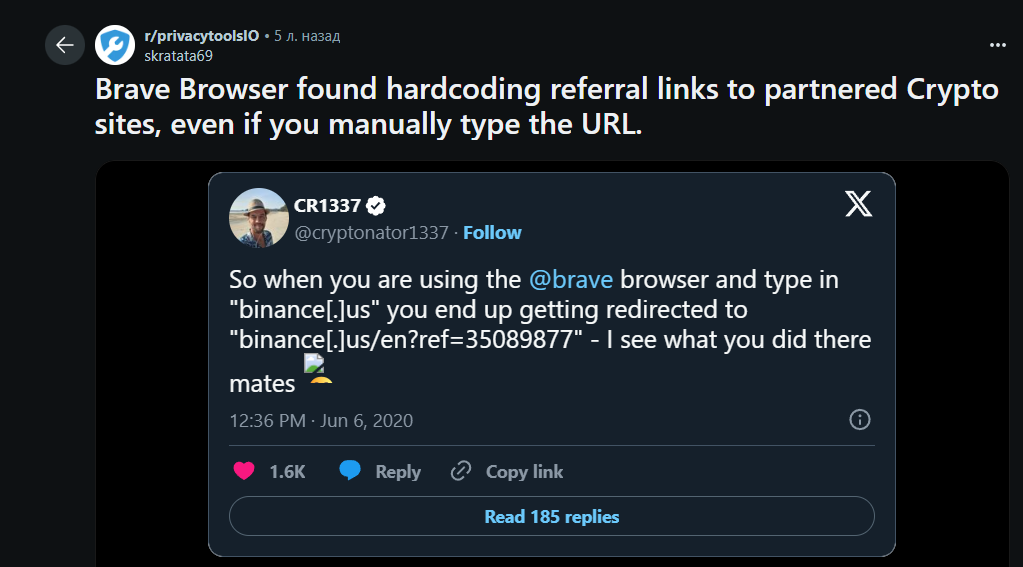 > НОРМАЛЬНЫЕ браузеры > Brave Ахахаха. Что там ещё из коробки у «нормальных браузеров»? Отключенный майнер? Рефки на криптобиржи? Спонсорские ноутбуки из китаеподвала?