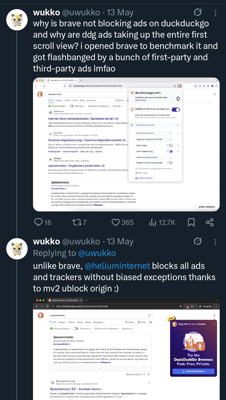 >>3643666 > Ну может в скором времени в пердэдже у тебя и уберут поддержку uBO и остальных расширений на mv2. > СКОРО Вот, когда уберут, тогда и приходи, а покуда в магазине расширений Microsoft теплится uBlock Origin, мне нет нужды пердолькать флаги и ставить костыли для установки uBO из Chrome Store. WAIT... OH, SHI... Там же только dev build остался, релиз снесли. Тогда мне нет нужды чекать что там в репозитории горхилла на хостинге от разработчиков Edge и ручками обновлять uBO, распаковывая zip. И самое главное, что у меня интегрированное в ОС решение, а не сторонняя васянка.