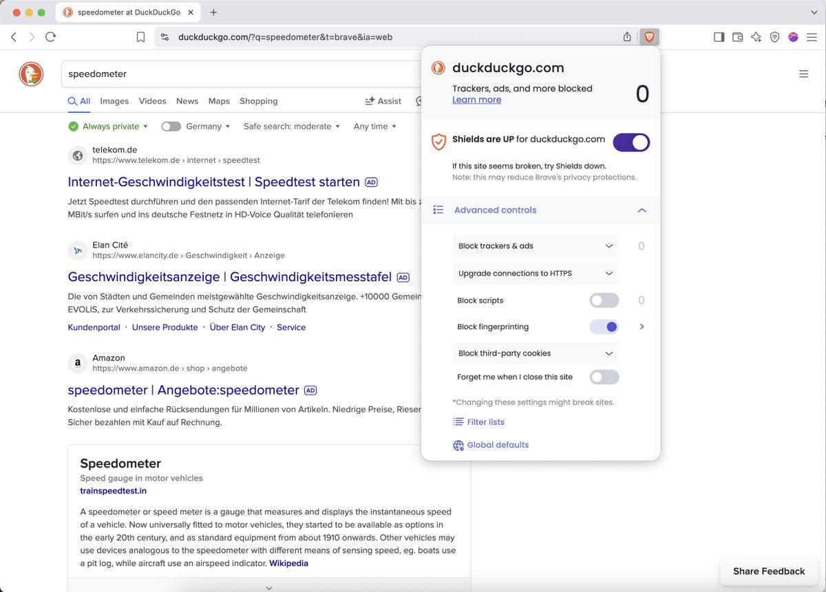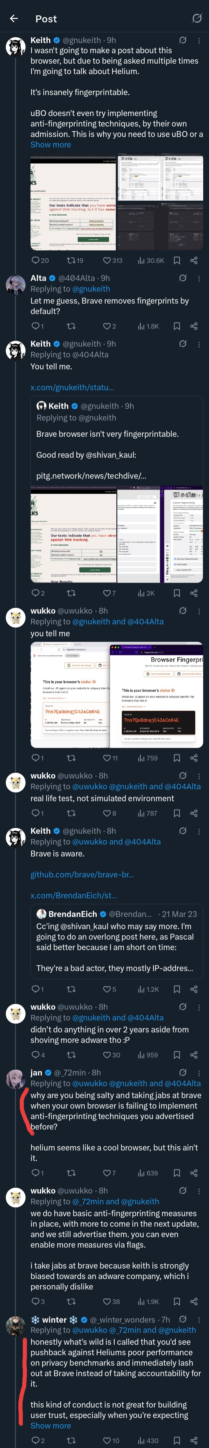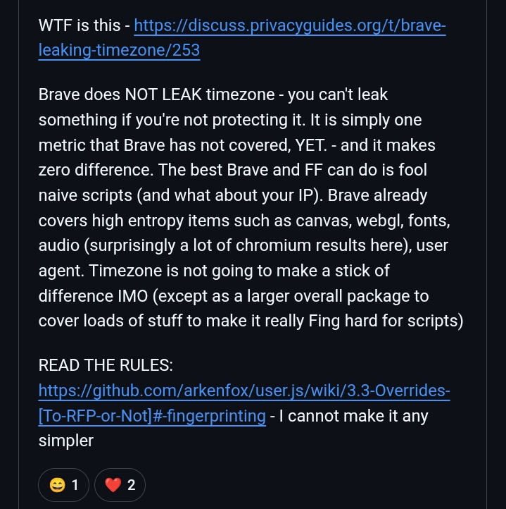 >>3650714 > таким образом ты наоборот себя делаешь более уникальным А кстати поэтому брейв и убрали агрессивную борьбу с фингерпринтингом. > И там у брейва нихуя не спуфинг, а рандомизация. Спуфинг это в лисе. У брейва и то, и то, зачем опять мне напиздел? > Покажи как Ебло, ну включаешь впн и смотришь. Я например пробовал еще через встроенный тор, так вот с допустим айпишником Германии время переводится на час назад. > На кой хуй Муллвад просит размер окна вернуть при его изменении и Letterbox включает? Угу угу угу, зощита, приватность, омномнимность, блокировка ануспринтинга. Думаешь нормальный человек, не пуганный красноглазиками, будет заниматься всей этой хуйней? Лол. > опять же засрешься как на выгрузке и заморозке вкладок. А разве я засирался там? Кажись тебе опять мерещится.