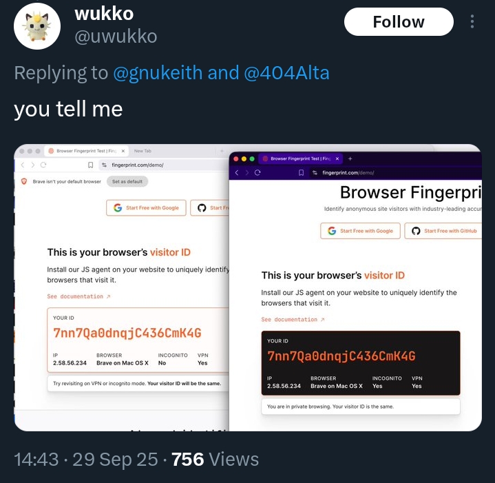 >>3650837 >Ебана рот!!!1!1! Да ну нахуй!! Вотжэж блядь, а!!!! Вот незадача то а!!!!! Атслидьяяят!!! Атслидьят точна точна говорю!!! Батюшки, что же будит то!!! Как же аутиста порвало. А ведь это самые используемые отпечатки для отслеживания пользователя. https://fingerprint.com/blog/browser-fingerprint-prevention/ Забавно, что спустя столько лет мани до сих пор палятся по несовпадению таймзоны-VPN. >В чем твоя проблема? Почему у тебя вечно что-то не работает? Проблема в том, что пиздабол пытается наебать и пруфов не предоставляет, кроме как У МИНЯ РАБОТАИТ. >Я тебе с самого начала сказал, что вариантом будет поставить аддон. Васян на аддоне смог, а компания разработчик приватного браузера не может это внедрить? Кек.