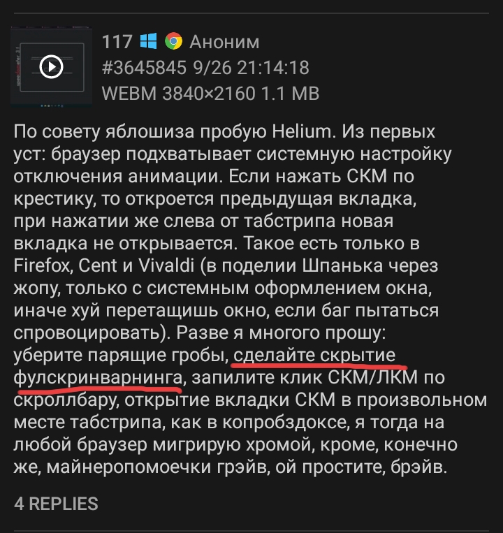 >>3643486 Да, у вивальди проблемы с анимациями (точнее их отключением: работает через раз), но всё ещё лучше, чем у васянки брейв, это на видриле видно. Только Firefox и Edge вменяемо подхватывают системную настройку выключения анимации, не открывая вкладки с эффектами смещения как в колхозных презентациях.
