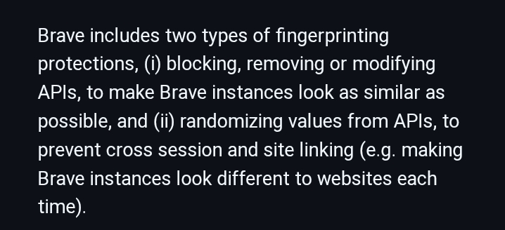 >>3650712 >Аддон установи и все. А фингерпринты и так спуфятся. Любые манипуляции с отпечатком в хроме с помощью расширений легко детектятся высирая кучу ошибок при их чтении, таким образом ты наоборот себя делаешь более уникальным. Держу в курсе. И там у брейва нихуя не спуфинг, а рандомизация. Спуфинг это в лисе. Какого-то хуя реальная видеокарта сливается и фиксится только выключением самого WebGL. В ангугле флаг на подмену видеокарты есть. >Пиздишь, брейв то может. Покажи как, не видел нигде там смены часового пояса. >На кой хуй оно тебе надо, болезненный? На кой хуй Муллвад просит размер окна вернуть при его изменении и Letterbox включает? М, болезненный? Не разбираешься - не лезь нахуй, опять же засрешься как на выгрузке и заморозке вкладок.