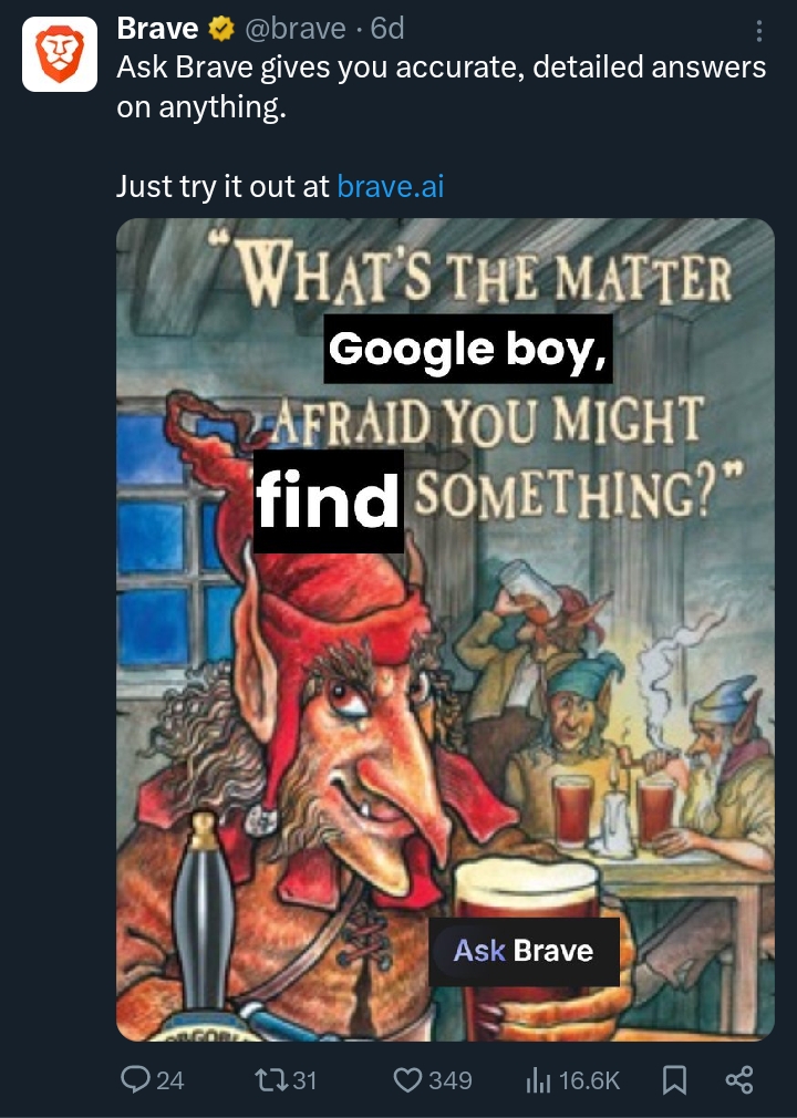 А вообще, я вот сейчас понял, что брейв это таки истинно браузер для посвященных. Копробздэнькам и рабам индусских кулаков не понять. Правильно ты назвал его васянкой. Но тут все упирается в кругозор человека, называющего что-то васянкой. Ты наверняка подразумевал, что это "плохо", что это значит то, что браузер не доделан и тому подобное. Но в моем понимании это означает то, что т.н. васяны заинтересованы в дальнейшем развитии своего браузера. Они это делают не только для денежной выгоды, но и для удовольствия. Ungoogled, Vivaldi, Cromite, Brave - вот те, кто в конце выйдет победителями. Вы ещё припомните мои слова.