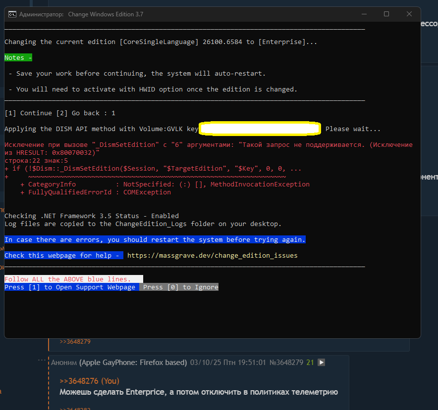 >>3648297 Попробуй так, сначала перезагрузись как там предлагают, потом попробуй сначала на прошку перейти. Потом если получится, перезагрузишься ещё раз и с прошки перейдешь на тырпрайз.