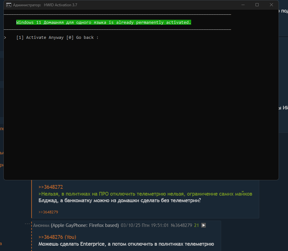 >>3648244 (OP) >>3648093 → >30 секунд в павершелле, буквально 1 команда, а потом 2 раза нажать на клавишу 1, когда попросит скрипт >>3648076 → >Надо будет дефолтный ключ редакции ввести, чтобы "отвязать" себя от "бизнес" канала и перевестись на "консумерский", потому что у них там лицензирование как-то иначе идёт. У меня сейчас легальная Домашняя одноязычная. МОжно ли через повершелл и irm https://get.activated.win | iex сделать ее консумер профешшионал без телеметрии?