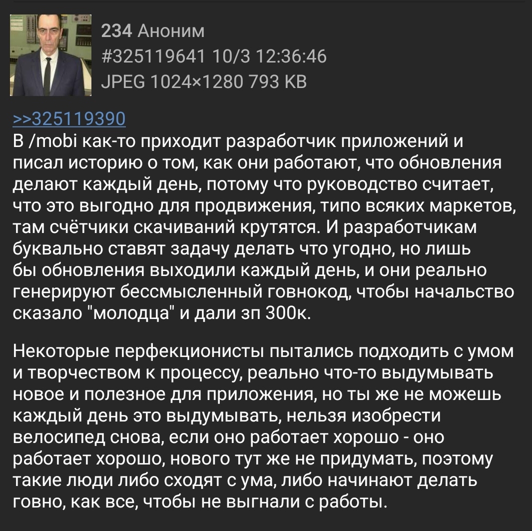 >>3649525 > И меня всегда поражает такое пренебрежение к пользователю, они не пытаются понять, что нужно людям, а что нет, а просто ставят перед фактом - теперь будет так. Почему так - непонятно, просто вот так и всё. у меня старший брат пидарас был такой, арррряяяяя пачиму ты клиентов спрашиваешь как они хотят? ТЫ ЖЕ ПРОФЕССИОНАЛ! тебе лучше знать как надо! накидай тупо эффектов и переходов между фото да и всё и так сойдёт