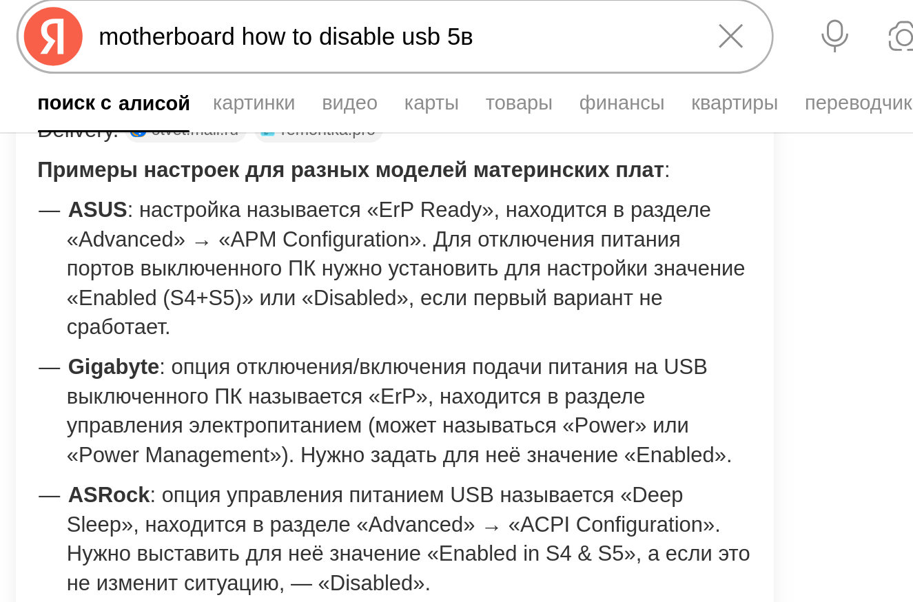 >>3649687 > что бы отключить питание на usb порты при выключенном ПК А нахуя? Всякие часы или зарядники для телефонов, которые в комп втыкаются, нехай будут запитаны.