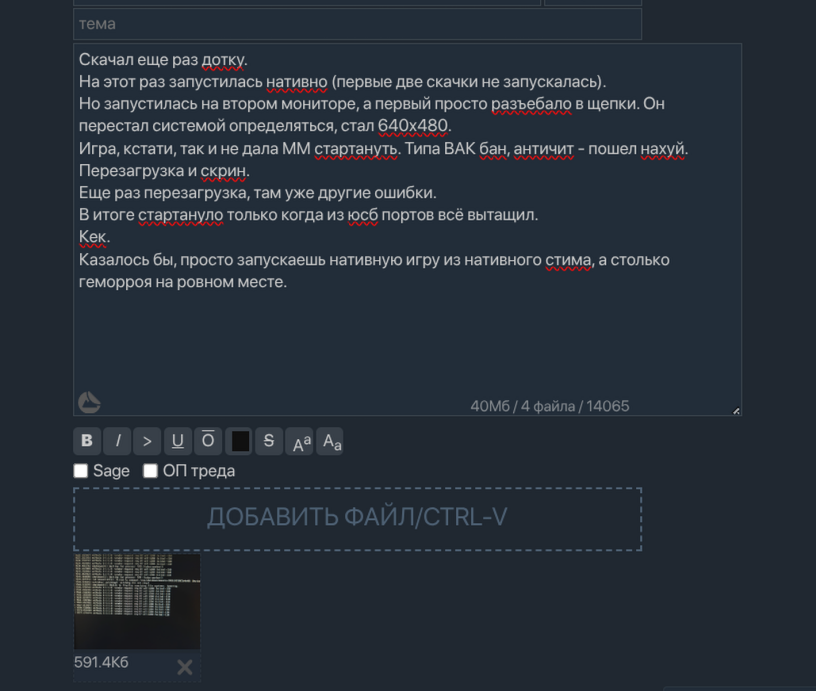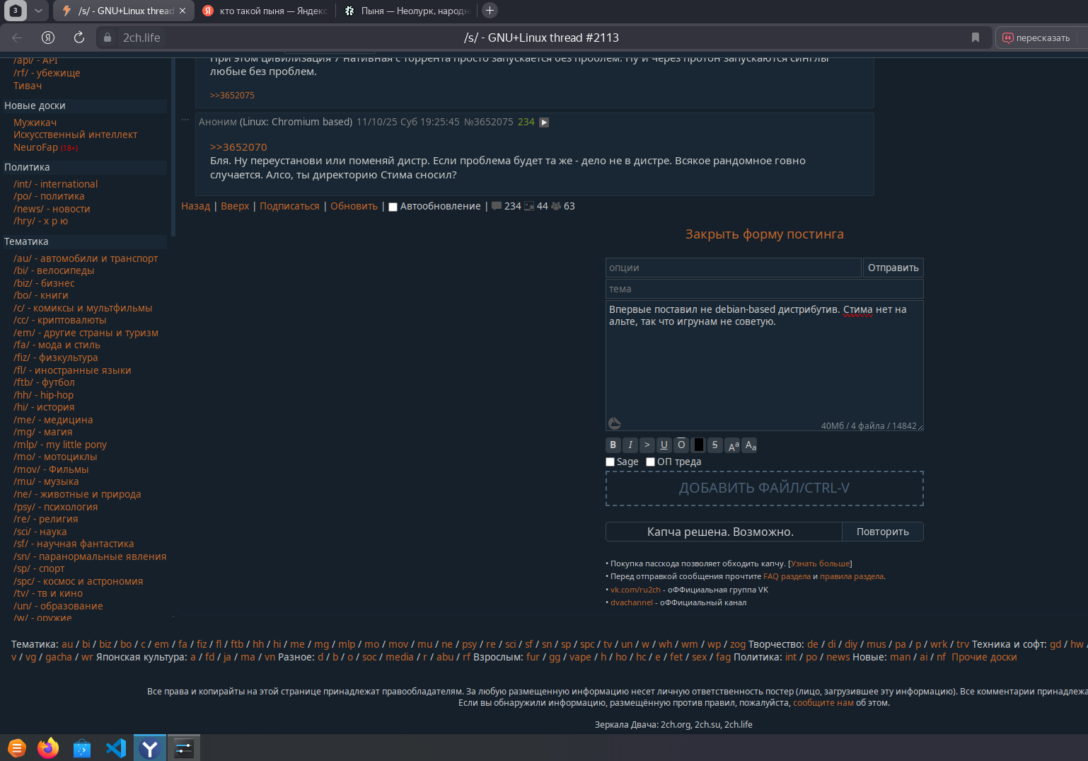 Проблемы за сегодня: Отъебнуло чет с usb, система перестала загружаться. Помогло выдернуть все девайсы и полностью вырубить питание. Иногда терминал не принимал пароль. Возможно связано с первой проблемой. При попытке скачать любую кастомизацию в кедах выдавало ошибку. При переводе ютуба на втором мониторе в фул окно, показывало черный экран вместо изображения. И все это по сути на ровном месте, ведь я нихуя не делал, кроме листания двачей и ютаба. Типа ну ебаный рот, как это говно рождается из ниоткуда? При этом есть аспекты, в которых линукс мне нравится на голову больше, чем винда. Но винда не ебет мозги в классических сценариях, если ее спецом не драконить. Здесь же почему-то ломается то, от чего вроде и не ждешь геморроя.