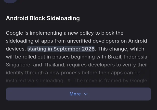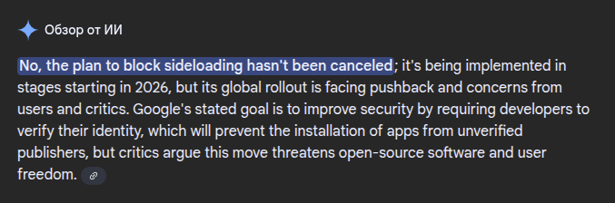 >>3651645 Да хер там плавал. Цианоген билдится на AOSP, который Гугл тоже всеми силами постепенно ограничивает как раз чтобы всякие умники не пилили свои цианогены. Как сайдлоад закроется - начнут душить ещё сильнее.