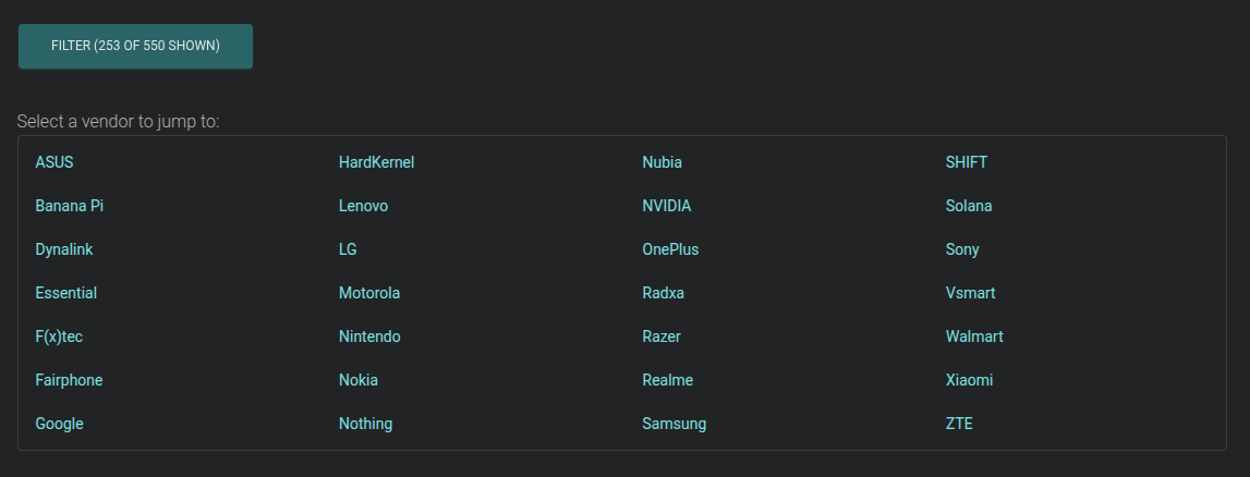>>3651677 Заходишь на сайт LineageOS или /e/OS и смотришь список вендоров, под модели которых есть актуальные билды прошивок. Мне с телефона неудобно руками простыню эту переписывать.