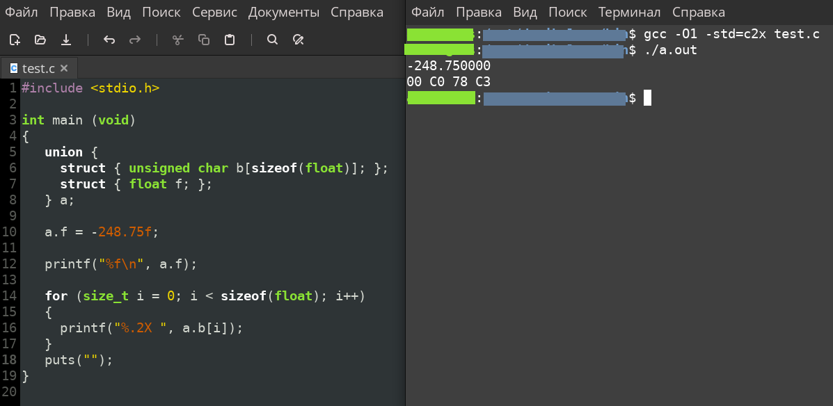 я создал единую структуру 4 байта через .f записал вещественный литерал, через .b[] прочитал побайтово. можно в обратную сторону через .b[] = записать побайтово, а через .f посмотреть что получилось.