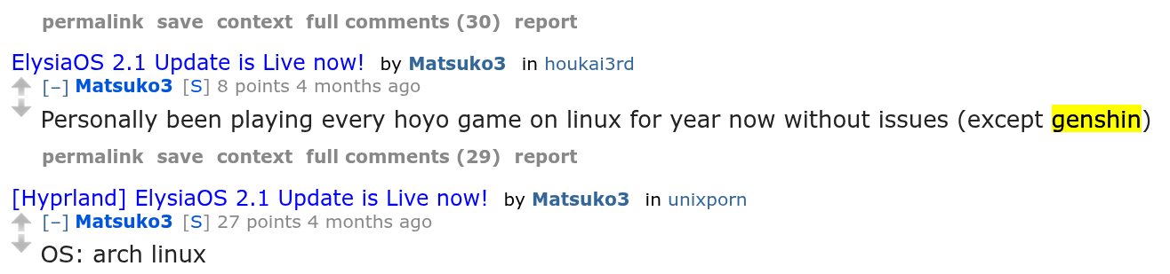 >>3677683 Помимо того что никсось неоч популярный дистр, он ещё и не очень известный Гента же, как и слака, были популярны раньше, условно 20 лет назад, а никс никогда популярным особо и не был А арч это самый популярный дистрибутив я так думаю, среди линуксоидов (если брать таковых завсегдатаев пингвинуса, /s/ тредов борд, лора, опеннетов и всех всех). Алсу мемы по никсу я точно видел >>3677697 После 7 перестала нравится дизайнерски, пользоваться в 2022 было тяжело. Немного попользовался KDE Plasma 4, понравилось. Потом она уже ушла окончательно в мир иной, но и я уже вкатился окончательно.