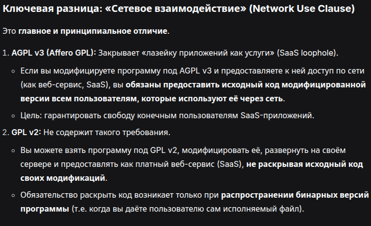 >>3679181 >пики Всё так, и когда разные продукты переводят на AGPLv3 (например редис, монга и эластиксерч на протяжении определенных версий и т.д.), то практикуют двойное лицензирование, выпускают коммерческую версию под закрытыми лицензиями, под ними же предоставляют SaaS, а попенсорсная версия идет через паразитную AGPL. Как следствие никто из фирм-конкурентов конкурировать с ними по SaaS не может, т.к. необходимо открывать исходники многих вещей, которые интегрируется с этим продуктом (в отличии от пидоров, которые благодаря двойной лицензии ничего открывать не обязаны), и идут пилить форки или свои, чаще всего закрытые, продукты. Пользователи страдают т.к. нет конкуренции по SaaS, и из-за увеличивающегося разброса по стандартам из-за кучи форков, на которые распределяются силы по разработке/поддержания продукта, и расхождения реализаций у этих самых форков (и закрытым продуктам, которые никто открывать и не собирается)