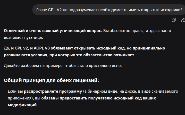 >>3679154 Это в госучереждениях. А в 11м году я напоминаю началась такая тема что приходили маски-шоу в контору и если нет лицензии подтверждающей лицензии ПО то уносили компы/сервера. Опять таки напоминаю что в те времена к цифровой инфраструктуре и бизнесу относились как к ларьку с пивом, а законы были составлены так что только чек на покупку ПО являлся подтверждением его легальности. С тех пор мягко говоря много чего произошло и GPL таки признается на юридическом уровне https://www.linux.org.ru/news/russia/18101384