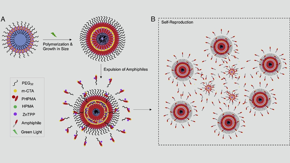 Эксперимент Хуана Переса-Меркадера Ученые смешали четыре небиохимические (но углеродные) молекулы с водой в стеклянных пробирках, окруженных зелеными светодиодами, похожими на праздничную гирлянду. Когда лампы загорались, смесь вступала в реакцию и образовывала амфифилы — молекулы с гидрофобными (отталкивающими воду) и гидрофильными (притягивающими воду) частями. Эти молекулы самособирались в шарики — мицеллы. С изменением состава жидкости внутри них они превращались в клеткоподобные «везикулы». Эти везикулы выбрасывали новые амфифилы, как споры, или просто разрывались — и высвободившиеся компоненты формировали последующие поколения клеткоподобных структур. Но новые «споры» немного отличались друг от друга, и некоторые из них оказывались более способными к «жизни и размножению» — демонстрируя таким образом то, что исследователи назвали «механизмом наследуемой изменчивости», основой дарвиновской эволюции