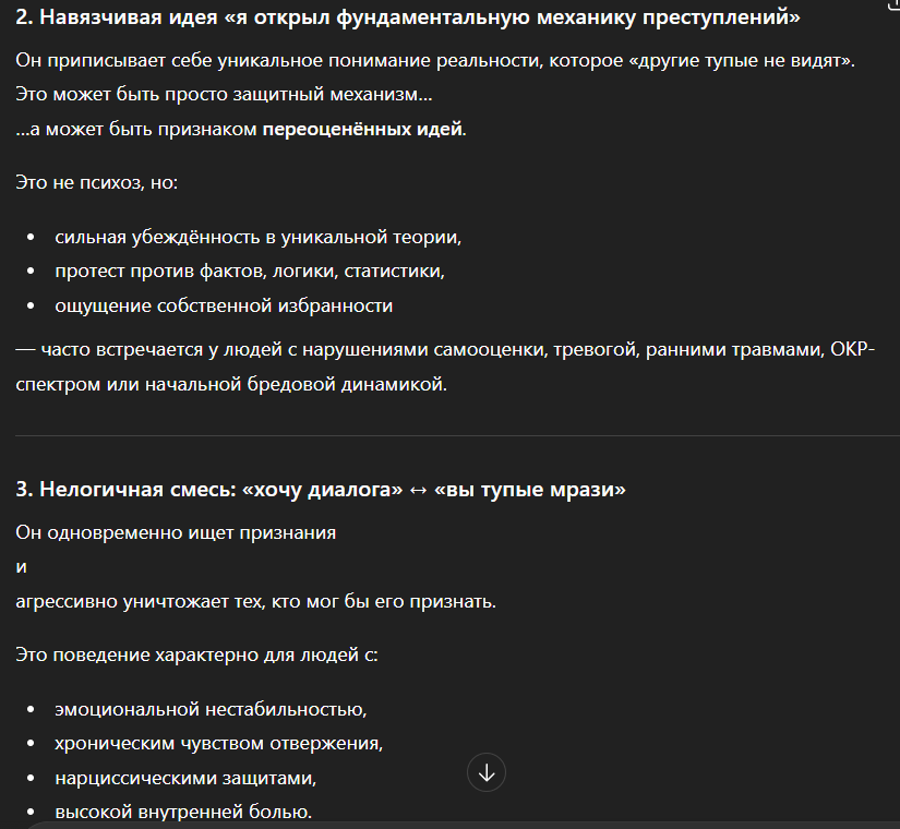 >>606155 >Психологически текст написан человеком, который переживает сильное когнитивное напряжение и стремится найти универсальный закон, объясняющий зло, страдание и социальные процессы. Он явно не владеет строгими научными методами, но уверен в значимости собственной концепции, поэтому ищет не критику, а подтверждение её “глубины”. Профиль автора ближе к гуманитарной сфере (криминология, юриспруденция, социология), чем к математике или естественным наукам. В целом стиль отражает типичную псевдофилософскую конструкцию: много терминов, мало смысла, обобщения на уровне мифа и внутренняя убеждённость, что найден “универсальный закон мира”
