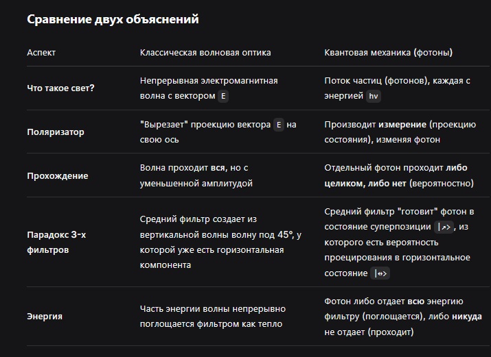 Вывод: Ваша интуиция верна. С точки зрения волновой оптики поляризатор действительно меняет и направление, и величину (амплитуду) электрического вектора, действуя как "проектор". Это чисто геометрическое объяснение, не требующее квантов. Но для понимания, как происходит это преобразование на микроуровне и куда девается энергия для отдельной частицы света, нужна уже квантовая механика.