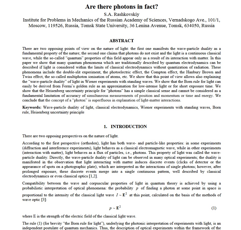 >Следует отметить, что в любом эксперименте мы не можем непосредственно увидеть фотон: мы судим о его наличии только косвенно на основе дискретных событий, регистрируемых детектором. Попытки автора в беседах с экспериментаторами, работающими с так называемыми «одиночными фотонами», выяснить, как они представляют себе «одиночный фотон», показали, что никто из них не может сформулировать, что это такое: «фотон». Для большинства из них фотон — это некое интуитивное, расплывчатое, нечеткое понятие, существующее на подсознательном уровне, что, однако, не мешает им получать практически важные и интересные результаты. Как показало это исследование, чаще всего экспериментаторы ассоциируют «фотон» с изолированным волновым пакетом, в котором волна считается вполне классической. Это еще раз показывает, что не только теоретики, но и экспериментаторы, работающие с «одиночными фотонами», не представляют себе объект, с которым они работают.