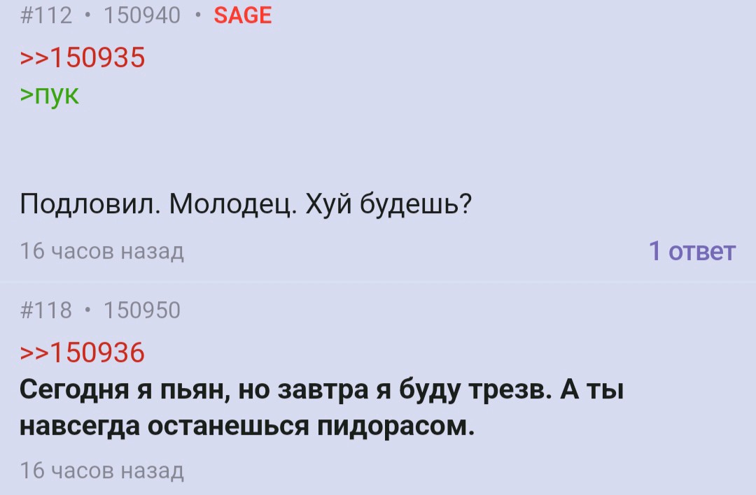 >>150979 → Как писал вчера: "сегодня я пьян, но завтра я буду трезв, а ты на всю жизнь останешься пидорасом". Подумай над моими словами - если есть, чем, конечно. К слову, сеансов употребления в этом году у меня можно пересчитать по пальцам одной руки. Но ты всё равно будешь считать, что я пьянь и, цепляясь за это, гнуть свою линию.