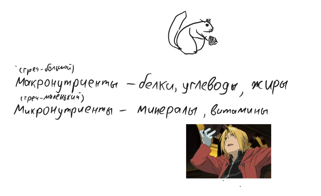 Дратути чуваки. Не получается у меня быть продуктивным. Я вроде бы пришел к одной просто суперской системе обучения. Ее принцип прост. Я читаю что-то, записываю своими словами основную мысль, придумываю визуальную ассоциацию, и рисую ее, объясняю мысль самому себе наипростейшими словами. К примеру, когда читал книжку про нутрициологию, записал два основных термина - микронутриенты и макронутриенты. Макронутриенты это у нас белки, жиры и углеводы. А визуальный образ для макронутриенты это жирная белка, хавающая уголь. Я ее нарисовал. При том БОЛЬШАЯ жирная белка хавающая уголь(ведь МАКРО - это большой с греческого). К термину микронутриенты мне в первую очередь вспомнился момент из Стального Алхимика, где Эдвард Элрик в церкви Лета зачитывает минеральный состав человека(ведь микронутриенты это минералы и витамины). Кстати Элрика в аниме очень часто стебут за низкий рост, что очень сходится к слову МИКРОнутриенты.