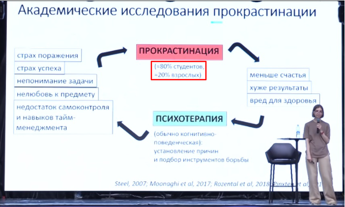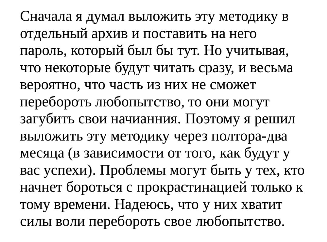 Рабочие проекты всегда тянул до последнего, иногда делая 80% за час до сдачи. При этом в условиях стресса довольно расторопно работал, когда времени даже "на подумать" нет. Но когда этих "условий стресса" стало не полчаса-час, а 6-7 часов за раб. день, уволился нахуй. Из единственного книжного, что понравилось: Джон Перри «Искусство прокрастинации. Как правильно тянуть время, лоботрясничать и откладывать на завтра». Там автор довольно философски относится к прокастинации. Тема "Никогда не делайте сегодня то, что завтра и делать-то, может, не придется" так вообще жиза, особенно если работа идёт в русле "концепция полностью поменялась" и так каждые пару часов/дней.