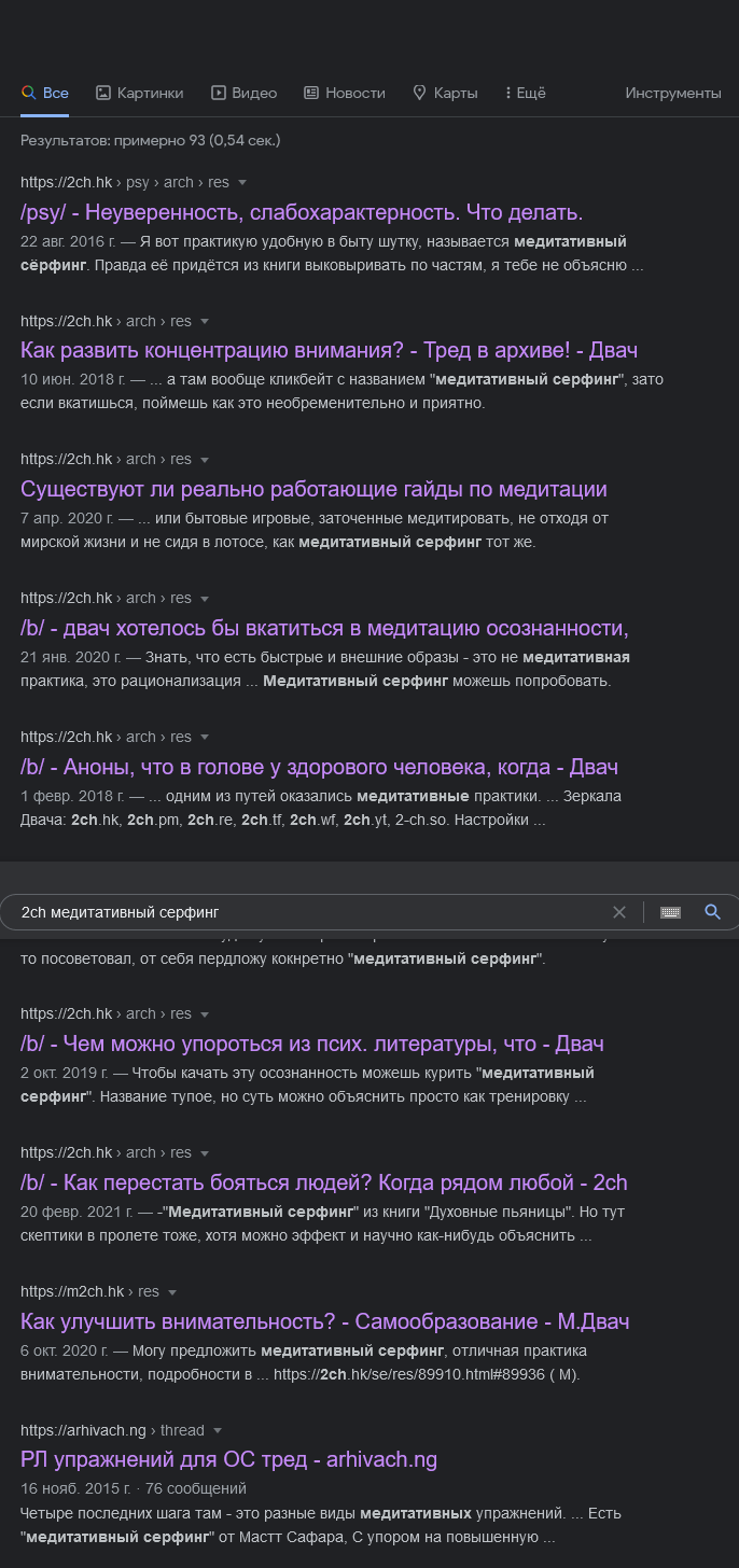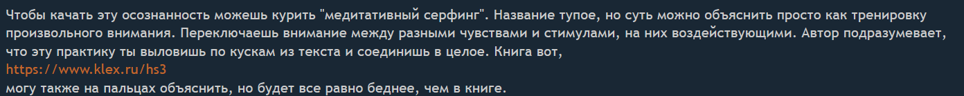 >>101284 (OP) >>101286 Вот этот верно говорит. Кстати, медитировать можно не только в статике, если медитацию понимать широко, как переключение внимания. Можно на разных аспектах воспринимаемого сосредотачиваться, углублять, будто резкость на картинке добавлять. Это сродни смакованию кофе или там обеда в противовес полусознательному проглатыванию. Могу порекомендовать "медитативный серфинг". Гуглится по "2ch медитативный серфинг", это я уже нахваливал анону раньше. Совсем от себя могу посоветовать "сенсорный отпечаток" для прогулок, у меня в кролик-треде где-то лежал. Это тоже про другое восприятие, чисто визуальное. Как бы начать видеть мир, словно произведение искусства, но вкат не моментальный, а по мере "натаптывания нейронной тропинки".
