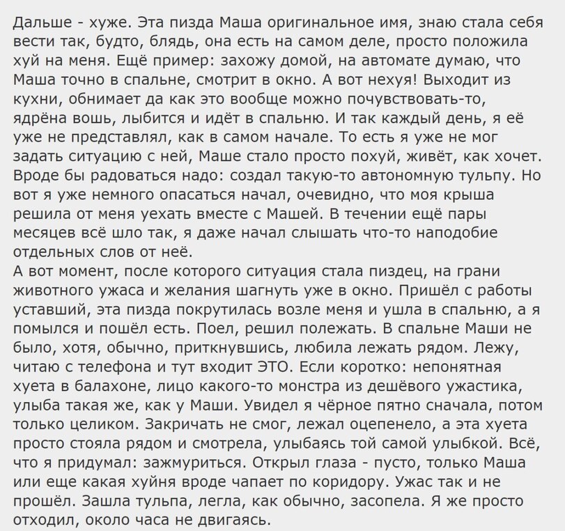 >>109139 >Только это реальность, а не пасты. Один тульповодов из-за тульпы своих родителей убил, многие люди сходят с ума и т.д. Ой бля-я-ядь... Пиздец, что у тебя в голове, если ты всерьёз думаешь, что это из-за тульп? В таких случаях всегда виновато окружение, чаще всего родители, плюс плохая генетика, всякие проблемы с головой. Ты ещё скажи что игры виноваты в том, что люди стрельбу в школах устраивают. Расскажи немного о себе, пожалуйста, мне всегда было интересно, что в голове у людей, которые в проблемах и поступках винят не первопричины, а совершенно постороннюю хуйню типа компьютерных игрушек или тульп как в этом случае. Я реально не понимаю, каким должно быть мировоззрение, чтобы принимать подобный бред за чистую монету. Вот такое >>109156 ещё вполне может быть, но чтоб тульпа изначально здорового человека подговорила на какую-нибудь хуйню... ну это просто невозможно. Никак. >Возможно, потому что это антиприродный процесс, под который наш мозг не спроектирован? Это не такой уж антиприродный процесс, мозг приучен создавать в голове второстепенные сущности. Не отлажен, да, и возникает в нормальных условиях обычно от высокого стресса, но если бы мозг действительно совсем не был приспособлен под такие дела, то тульп бы никто и никогда не создавал бы. >>109140 Ещё один фанат кулсторей интернетных.