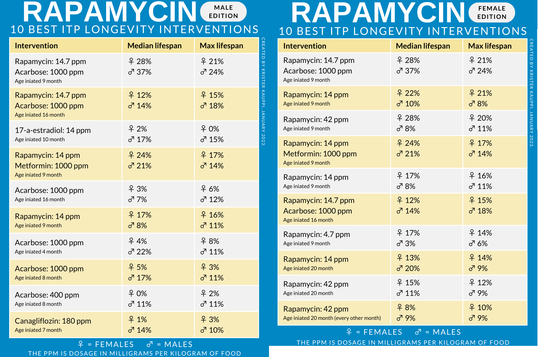 Помимо рапамицина есть и другие препараты, испытанные на мышах, которые, возможно, дадут буст по продолжительности жизни и человеку тоже. Глицин + Н-ацетилцистеин, альфа-кетоглутарат, та же акарбоза, еще некоторые. Но тут лучше подождать больше данных, их пока маловато исследовали.