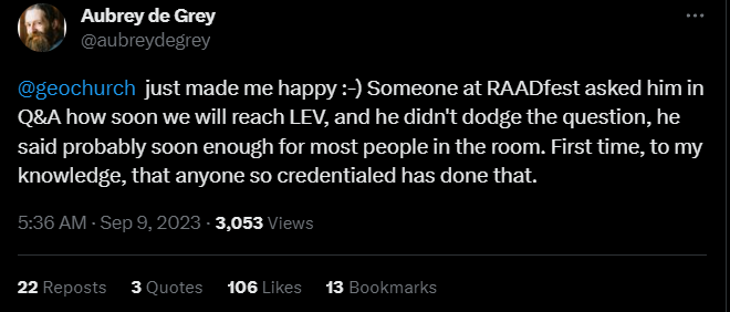 Довольно быстро он изменил свою риторику. Лет 5-7 назад он говорил, что не верит, что доживет до момента, когда омоложение станет доступно. А теперь он считает, что не то что у него самого, а даже у его бати, которому 83 года, есть хорошие шансы дожить.