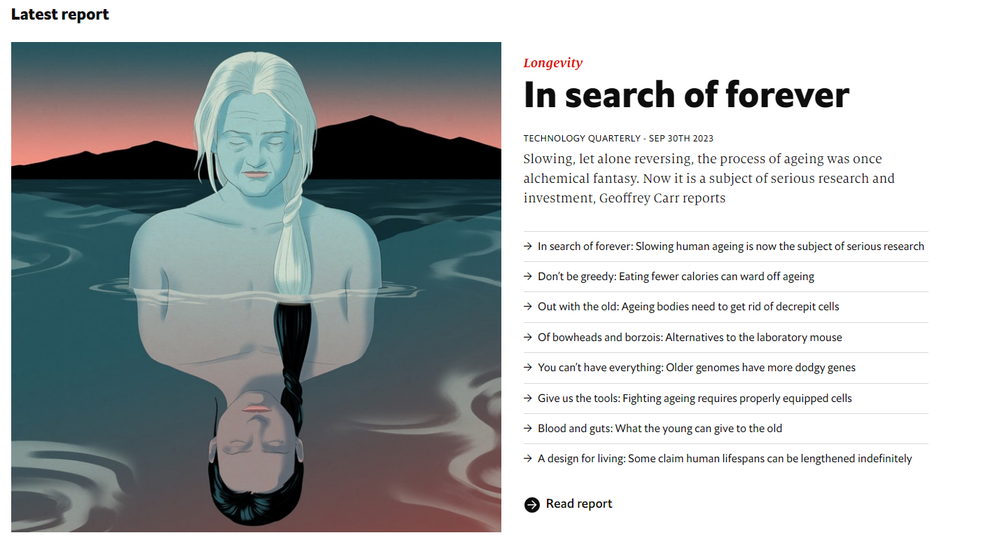 The Economist посвятили ежеквартальный репорт продлению жизни. Там ничего нового по сути, но радостно, что все больше внимания от мейнстримных изданий этой теме. Еще лет 10 назад все это было маргинальностью где-то на уровне НЛО. О продлении жизни писали только применительно к экспериментам на животных: мыши, черви, мухи. А теперь гляди-ка. Форбс, Блумберг, Таймс, Гардиан постоянно пишут о потенциальном омоложении/продлении жизни у людей.