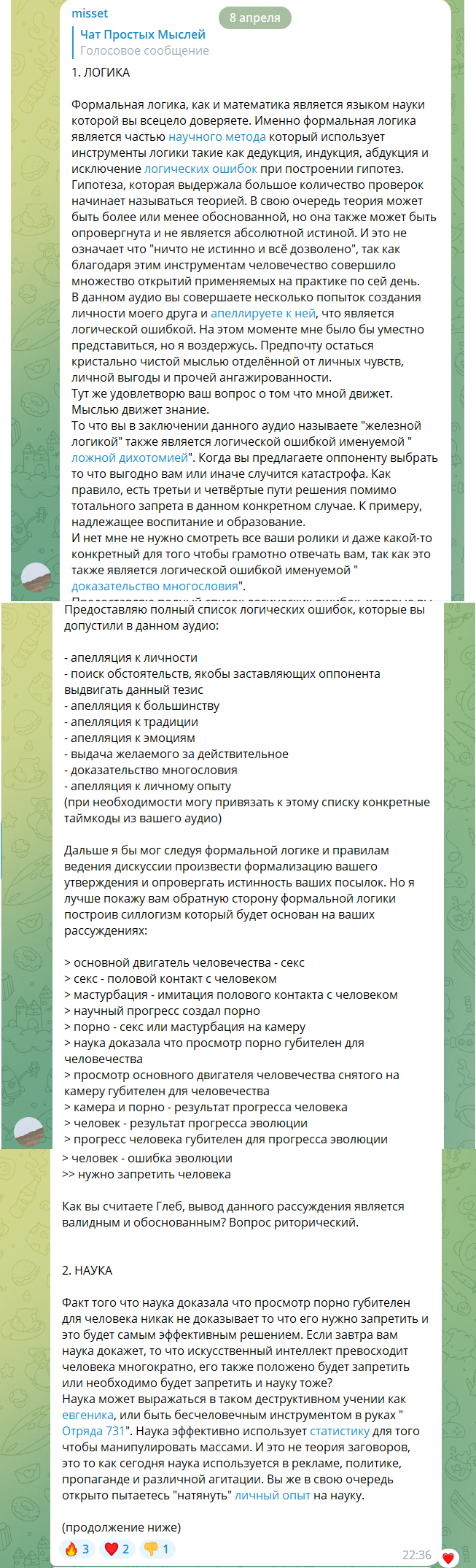 Хорошо, такое не для меня. Думаю, дай найду что-то серьезное, где люди любят, скажем, книги и их обсуждения или пытаются как-то расти умственно и духовно. Но в таких местах царит токсичность похлеще чем в доте. И это не просто прямая и неприкрытая токсичность, а такая, латентная, интеллектуально-снисходительная, потому что его мнение отлично от твоего и выражает он это презрение к тебе через стену текста (пик2), разбирая каждое твое слово, видимо думая, что это как-то повлияет на убеждение другого человека. И там просто начинается перекидка этими стенами текста в обе стороны до посинения. В таких сообществах каждый считает себя экспертом в любом вопросе и "кости тебе начнет пересчитывать", если ты будешь выражать другое мнение, да еще и если без подробной аргументации. В общем люди меряются длинной своего интеллекта и ни о каком развитии там вообще речи не идет.