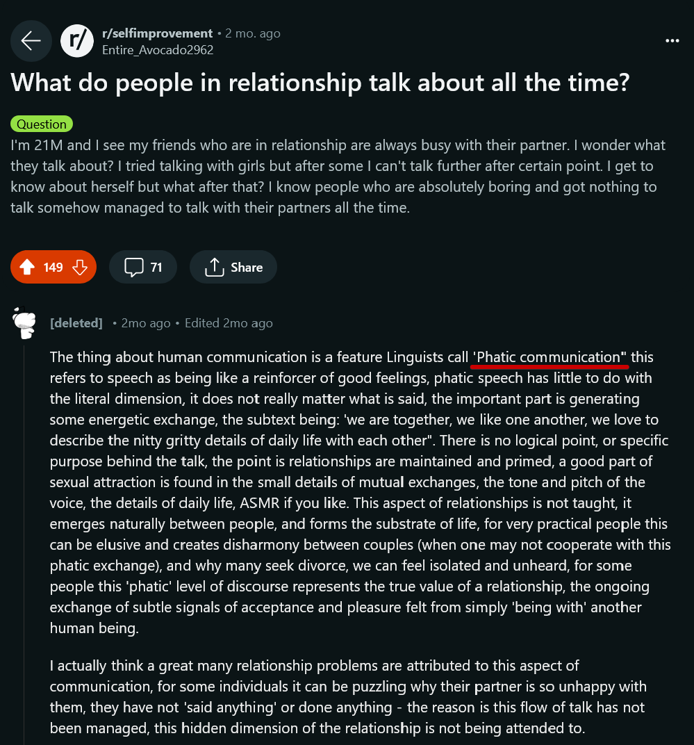 А вот в долгосрочных отношениях с тян по другому - реально общение может быть настолько пустым, что записав это в книжку в виде диалога будет похоже на отрывистый бред шизоида, но какая-то психоэмоциональная связь (можно назвать ее любовь) делает такие диалоги очень приятными и наполненными.