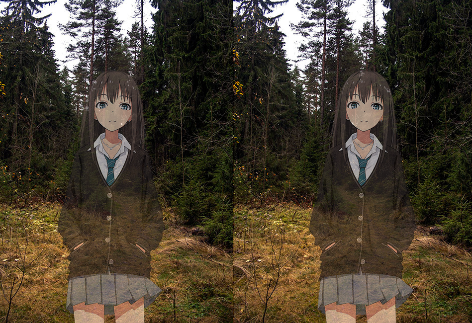 Как смотреть стереопары? Скосив оба глаза к носу и сложив левое изображение с правым. Да, это сложно, даже для тех, кто уже умеет. Вот вам пара разминочных. Рекомендуется сначала отдалиться от экрана и попрактиковаться. Потом приблизиться как обычно и попрактиковаться ещё, смотря только на фон пока он не станет совсем чётким. Потом уже разглядывать саму фигуру. Самый главный секрет — время. Всматриваться нужно долго. Больше минуты. Тогда детали не будут так расплываться. Всё нормально, чтобы детали не расплывались в воображении — тульповоды тренируются больше года, так что стереопара тут очень лайтовый вариант.