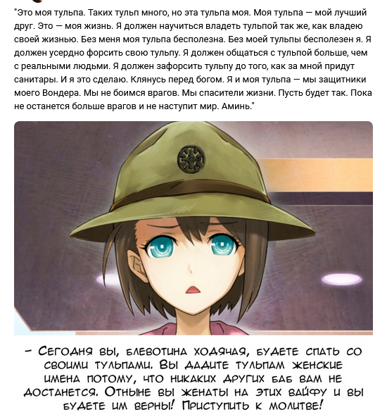 Краткое FAQ: 1.От этого можно поехать? Если имеются какие-то проблемы изначально, то можно нечаянно их активировать. С другой стороны, поехавшесть может помочь в форсе. Но лучше несколько раз подумать, прежде чем начинать, имея какие-то проблемы с психикой. Если всё-таки решитесь, главное — отбросить все предыдущие страхи. На заметку: тульпа — не шизофрения, а голоса при засыпании могут слышать все. 2.Зачем? Хочется идеального друга/идеальной любви, либо в целях самопознания и саморазвития. 3.Её можно, кхм, ну... того? Да, можно, если не веришь в суккубов и энергетический вампиризм. Однако подумайте: стали бы вы делать такое со своим творением, со своим дитём, которое по наивности примет такое как искреннее проявление любви? 4.Она прям как реальный человек? Разговаривает, общается, её видишь, чувствуешь? Почти. При долгом и упорном форсинге её голос будет вполне различим, а видимость тела может варьироваться от силуэтов на периферии зрения и просто очень качественного воображения до полупрозрачной и вполне себе детализированной модельки. 5.Сколько времени нужно, чтобы зафорсить тульпу? Если вы не готовы форсить больше шести месяцев, то начинать лучше не стоит, ведь вам придётся ежедневно посвящать время тульпе, да и само её создание для вас будет колоссальной работой над собой в плане воли и дисциплины. Сможете ли вы посвящать время не себе, а кому-то другому? Решайте сами. 6.У меня вопрос по вондеру... Тогда, для начала, прочитай это — http://pastebin.com/d7a69q7m 7.Нужна ли мне тульпа? Нет. 8.Почему тульпа носит бороду? Это она так пошутила.