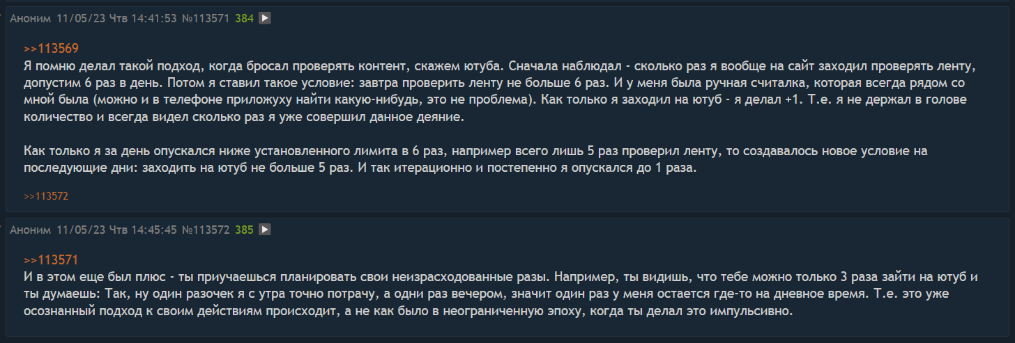 Но хорошая мысль в том, что замещая нежелательный источник дофамина на желаемый, можно перестроиться и избавиться от вредной привычки. Проблема правда в том, что нужно чтобы новый желаемый источник приносил достаточно удовольствия, чтобы мозг его пометил как "заебись". Но блять, что может быть более заебись чем соц. сетки, игры, дрочка, вкусно жрат? Собственно потому большая часть человечества имеет плотный набор зависимостей, сложно идти против своей эволюционно сложившейся нейрофизиологии. Мы не проходили отбор по устойчивостью перед "дешевым дофамином", его просто невозможно было получить. Теперь же его практически невозможно НЕ получать.
