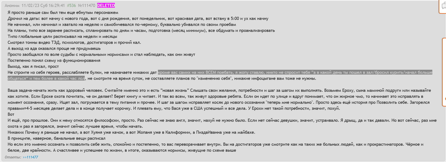 И проблема прокрастинации не в "просто начать", как один анон выше написал, а именно что в закрепить. Этих начал было уже сотни у людей. Именно поэтому очередное "просто начни", "просто сделай" у людей уже в горле комом сидит. И просто начинали и просто делали. Проблема гораздо глубже, но куда твоему великому разуму понять ее.
