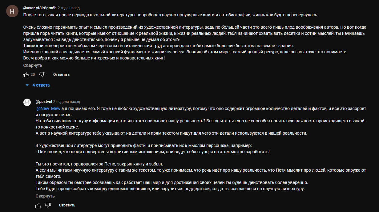 Как раз фишка в том, что развиваться можно не только изучая науку, а расширяя кругозор свой в творческом ключе. Расширяешь словарный запас. Опять же, как подметил Анон, ты получаешь чужой опыт. Ты оцениваешь поступки персонажей и примеряешь их на себя. проживаешь какие-то ситуации вместе с ними.