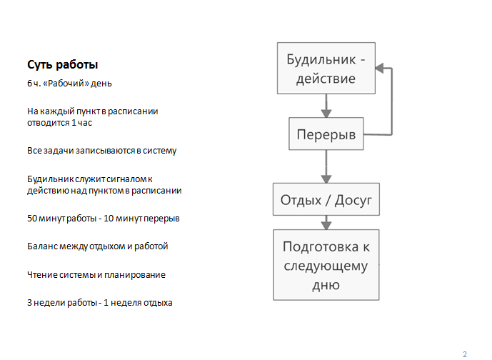Количество рабочих блоков: Определяется либо распорядком дня, либо необходимостью прервать работу, например, тратя время на перемещение. При возникновении дополнительных обстоятельств блок можно раздробить.