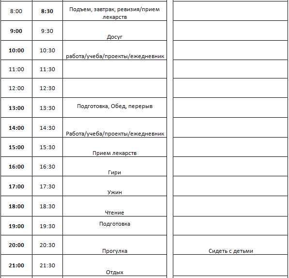 Ориентировочный оптимальный распорядок дня: подъем, гигиена, завтрак, отдых рабочий блок №1 обед, отдых рабочий блок №2 физические занятия, ужин, отдых рабочий блок №3 подведение итогов дня, планирование, гигиена, отдых отбой