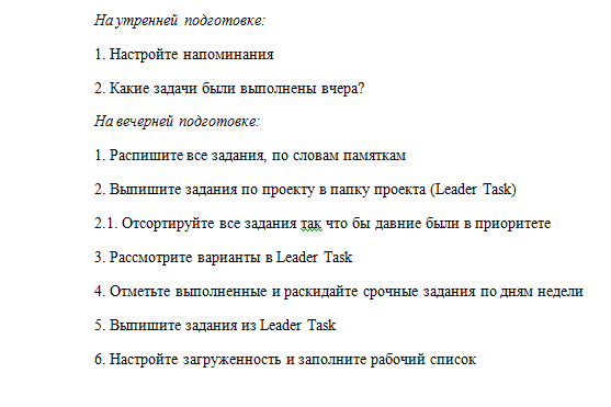 Распорядок дня (регламент служебного времени) – мера организации, призванная оптимизировать потери времени и энергии. Потери времени снижаются за счет правильного распределения рабочего и нерабочего времени. Потери энергии снижаются за счет оптимального сочетания работы и отдыха, заложенного в распорядке, а также за счет снижения времени планирования. В свою очередь время планирования снижается за счет того, что в распорядок заложены рабочие блоки, остается только определить временные регламенты внутри блоков и род работы.