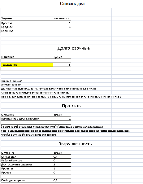 На пике экселевская таблица вставленная в вордовский документ. На ней определяется продолжительность рабочего дня, расставляются приоритеты, определяется свободное время и есть еще с запасом минут 20 на мелкие срочные поручения и проебы в определения сложности. Все типы задач простое, среднее и т.д. сокращены до среднего значения выполнения времени.