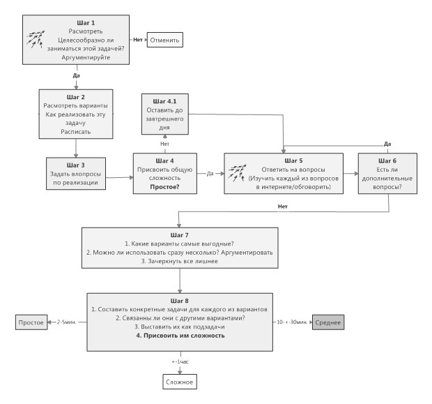 Ход работы: Первый заход – расставить приоритеты, начать выполнять первое задание. В конце каждого захода – оставлять отметку о том, с чего следует начать в следующий раз. В конце последнего захода – подвести итоги.