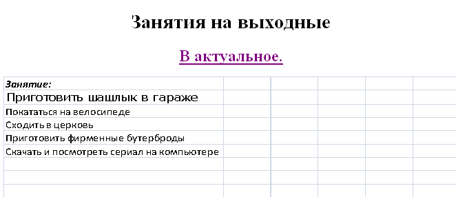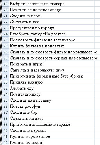 И еще в экселевской таблице с помощью формулы =ИНДЕКС(A19:A42;СЛУЧМЕЖДУ(1;25))для каждой из пяти строк сделал так что бы из списка что на первом пике генерировалось пять занятий на выходные. Для тех у кого есть лишние пару косарей на выходные и люди с которыми можно отдохнуть будет в самый раз.