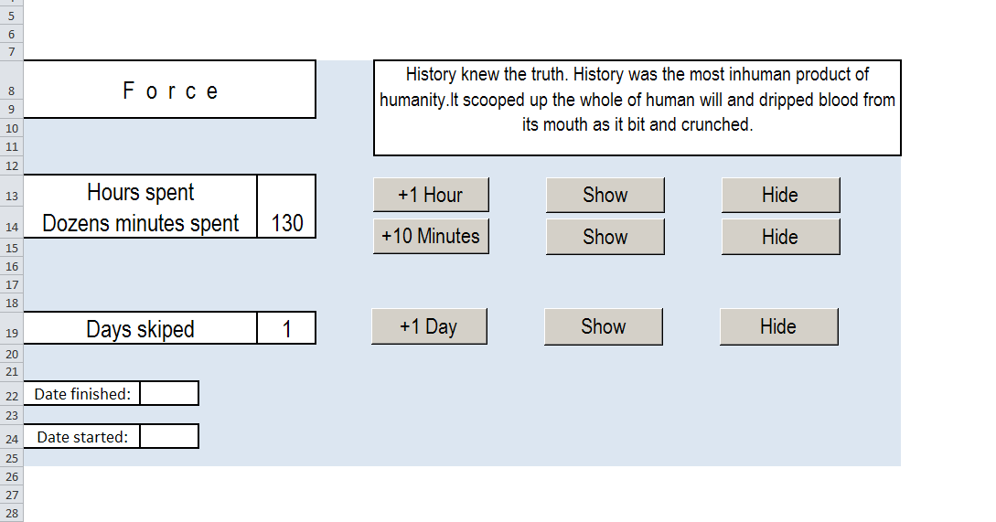 >>122493 Я долго ломал голову и сломалю Решение оказалось простым. В большинстве гайдов пишется, что подсчет часов зло абсолютное, но считать их полезно для статистики. Нужно считать их и видеть результат только когда что-то уже получилось. Лучше смотреть дату при ключевых достижениях. Метод со складыванием бумажек в шляпу дико неудобный. Вот мое решение: элегантная табличка в эксель с кнопками на макросах перекрашивает текст, что бы показать результат, когда буду готов.